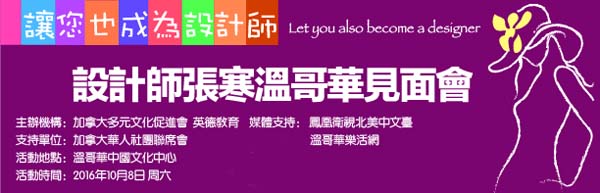 2016年10月8日,英德教育与加拿大多元文化促进会共同主办了设计师张寒温哥华见面会。